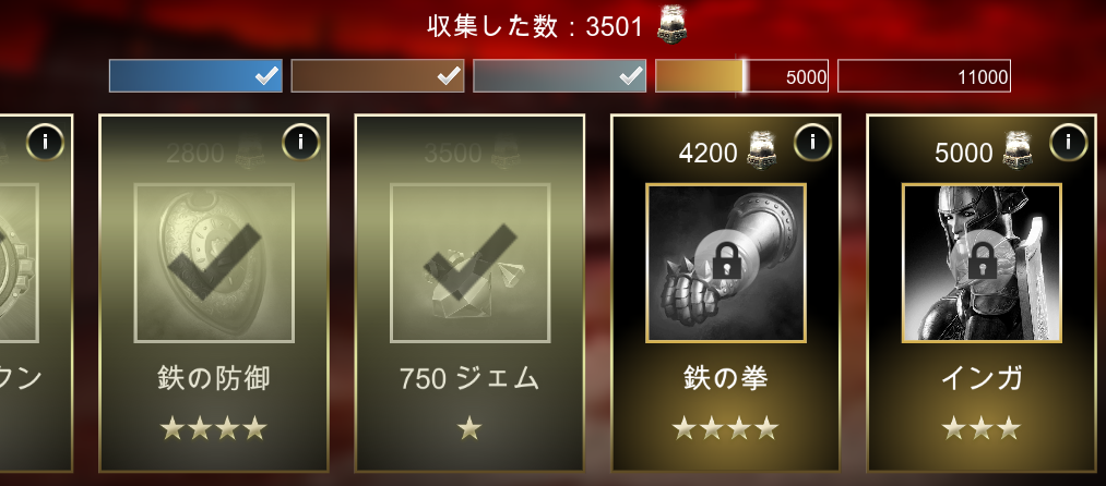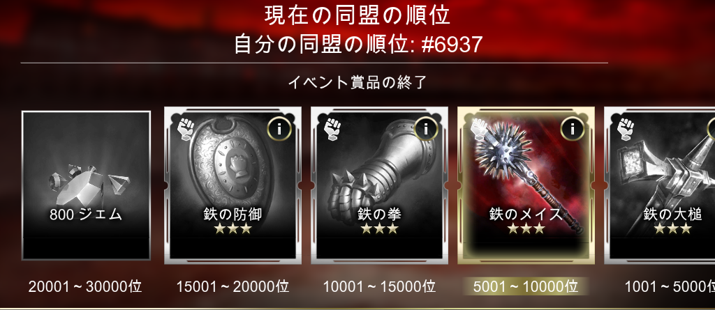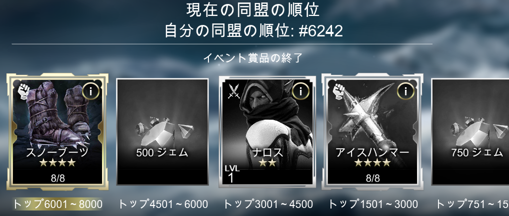 期間は10日間ぐらい。ちなみに金曜日?あたりから始まって 月曜日の8時か9時ごろ終わりました。 目標は☆3タイタン。 だったんだけど、全然無理。計算上 910回も戦争しなくちゃいけない。 1日91回ってどんな暇人? で、体力が超絶アップするスノーブーツ でいいや、と思ったけどやっぱ無理。 1日63回も戦争する程暇じゃないんで。 ところが! 同盟ランキングの報酬として考えるなら スノーブーツは楽勝。 ・・なのですが、外人だらけですから 勝手な人が多い・・ リセットしたり調整しながら綱渡り。 イベントは日本人同盟でやりたいですね。 ちなみに☆3タイタン、同盟ランキングだと さらに遠くなる。750位とかあり得ない。 期間的にリーグを2回渡ることになります。 脱退するとリセットされるのでできません。 開始前に資源は使い切ること。 攻められてもイベントアイテムは減りません。 防御するあまり、島を持たない人が居ますが みんなそんなことをしたらお互い損なので 島は持ちましょう。食料の島でもいいですから。 イベントアイテムは、自分の城レベルマイナス2レベル の島or都市が10個。それ以下だと1個ずつ減ります。 例:城レベル13でレベル9の島なら8個。 自分がそのリーグの王者になればよいイベントではないので 自分のレベルに見合ったリーグに行かないと損ですので注意。 このイベント、低レベルのほうが得かも。 例えば城7の場合、レベル5の島でも アイテムはMAXです。レベル3でも8個。 ブロンズの放置キャラだと、そのあたりの 島を抱えていることが多く、防御設定 していなかったり。☆1タイタンでも 大暴れるすることが出来ますね。 弱いプラス相手に困らない。 ☆3タイタン狙うなら低レベル推奨? © 2017 NaturalMotion. All rights reserved.