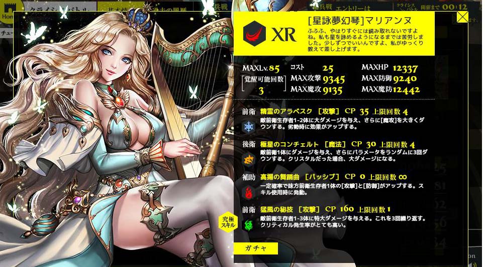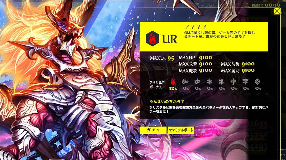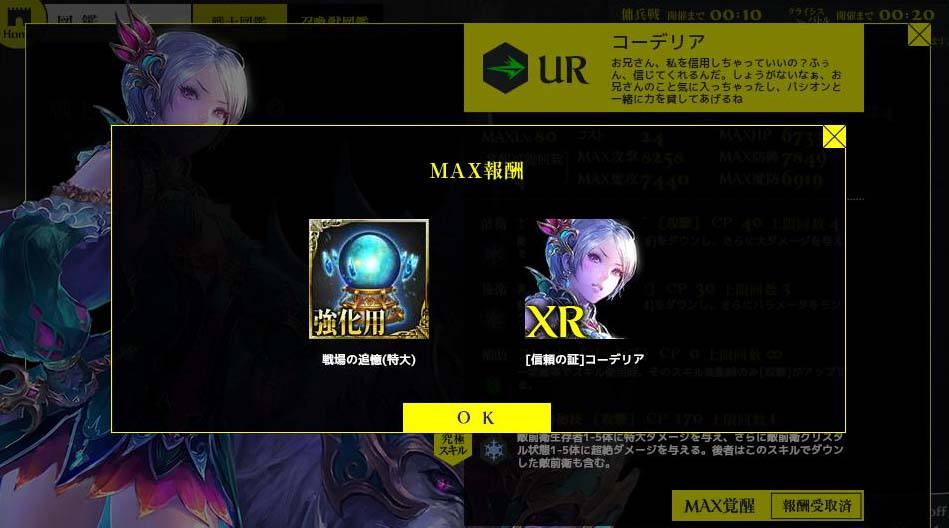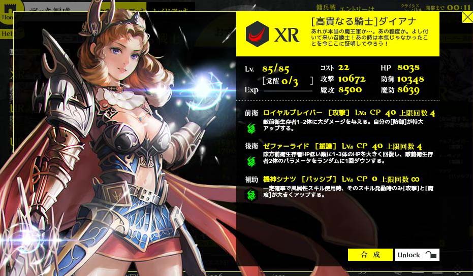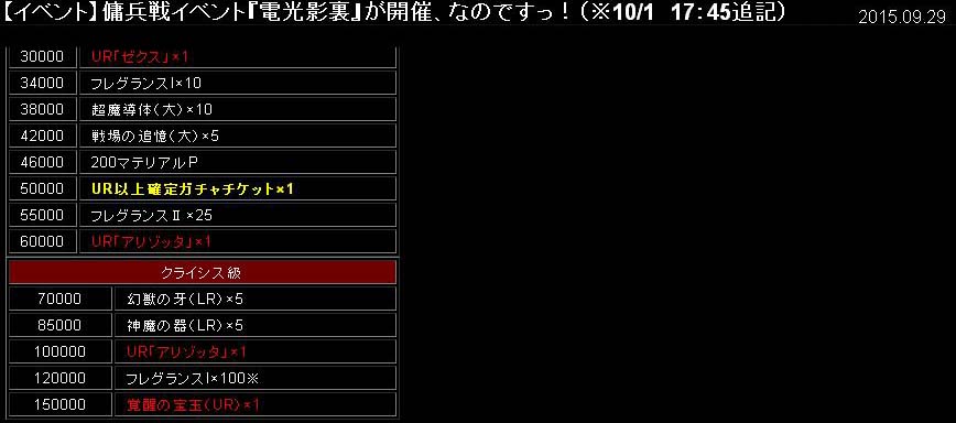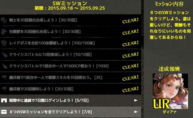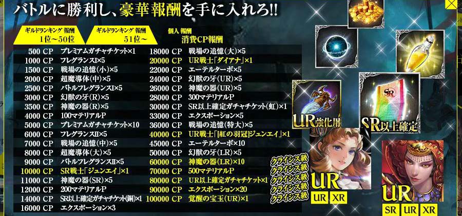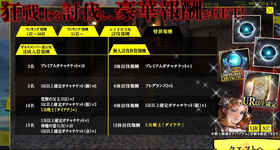 有難いことです。 ①9/1~レイド1000体報酬 ②9/8~CBイベ2万CP報酬 ③9/18~CBイベ2万CP報酬 ④9/18~レイド12種討伐報酬 ⑤9/18~イベントミッションコンプ報酬 どれも無課金で達成できる為、全員に配布と同義です。 ポーションの類はほとんど使わないと思います。 今回のCBイベは2万CPでダイアナが貰えるものの、覚醒URが10万CPに 設定されており、大ブーイング。アフリカtvでも苦情が殺到。そのせいか? 視聴者全員に覚醒URが配布されました。 レイドイベも並行して行われ、12体討伐完了でダイアナ。 ミッション完了でもダイアナ。大嫌いな傭兵戦が一番だるかった。 全ての条件を満たすと6枚のダイアナが貰えるはずで この念の入れようは「全てのユーザーにXRダイアナを」という 運営さまの意図があるのは間違いありません。今後どう 展開していくのか楽しみです。 Copyright © CORE EDGE All Rights Reserved.