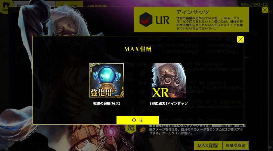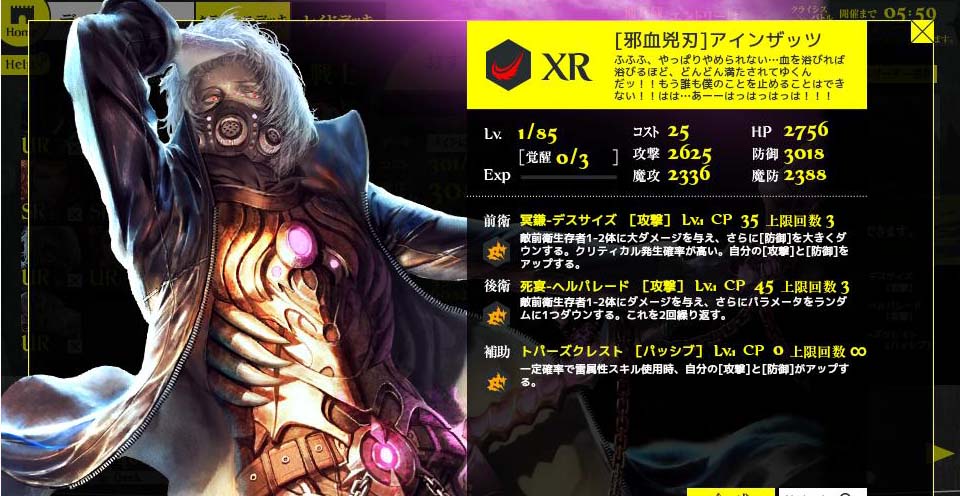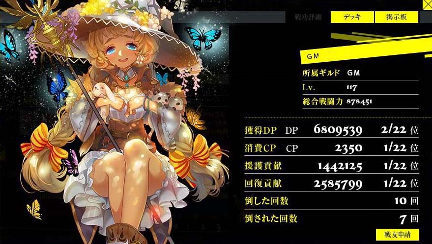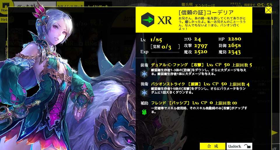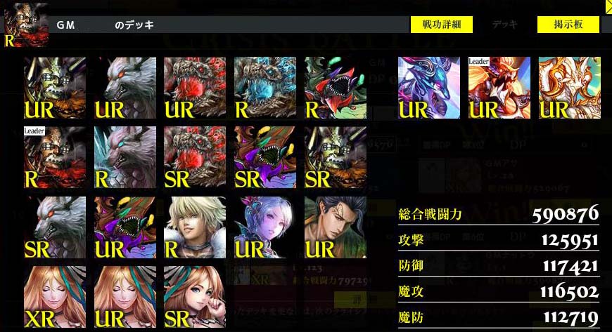 これが自分の最終目的でした。2枚のコーデリアで敵を弱体化! 2枚のアインザッツで敵を駆逐! あ、スキルを100にしないと意味ないですね。でもしません。 夢がかなったら終わりにしていいよね?もう疲れたよ。 この先にもう夢はありません。ゲームという夢の世界 に夢を持てなくなった時が辞め時です。 総評 7月開始、10月に引退。3ヶ月間、結構楽しめた。 ソーシャルゲーの中では優れていると思う。 但し札束ビンタゲーであることに変わりはなく だらだら続けるとお金が消えていく。 辞め時を間違えなければお勧め。 不満点 1日目に挙げた美しいカードが追加されず 不気味なのばかりで失望。このゲームの最大の 特徴はカードの美しさなのに、これじゃ やる気も失せる。 ではさよなら。 Copyright © CORE EDGE All Rights Reserved.