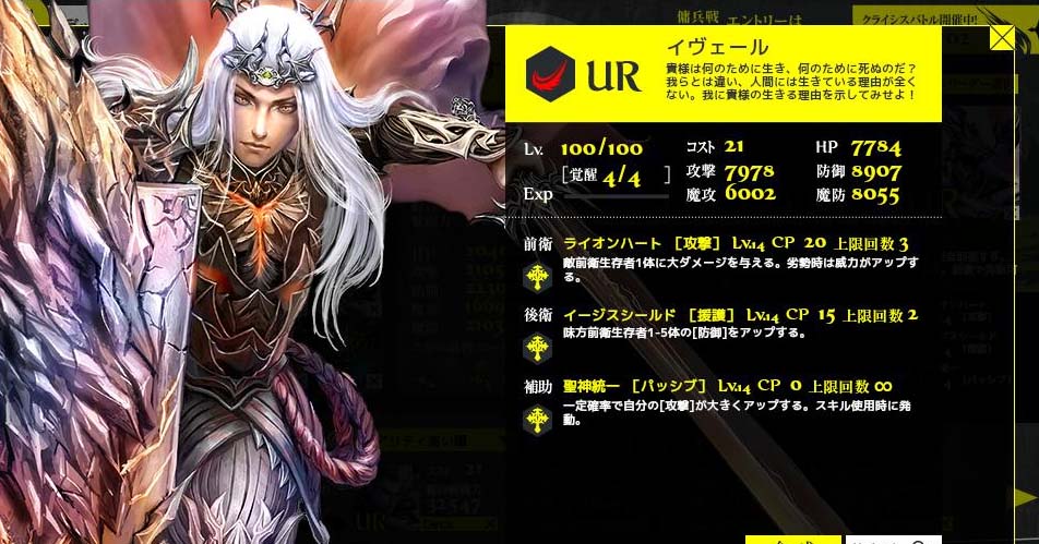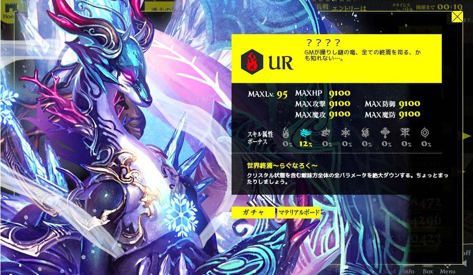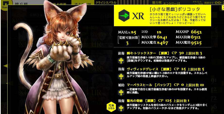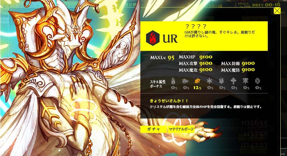 レベル1だそうで。敵キャラが多いですね わりと普通 ちょっと強そう 敵と味方の全パラメータを絶大アップ。 クリスタルを含む敵と味方のHPを完全回復。 これいいね。クリスタルのまま寝ているのもつまらないし クリスタルを叩くのもつまらない。いっそ実装して欲しい。 可愛いですね。そんだけ。 Copyright © CORE EDGE All Rights Reserved.
