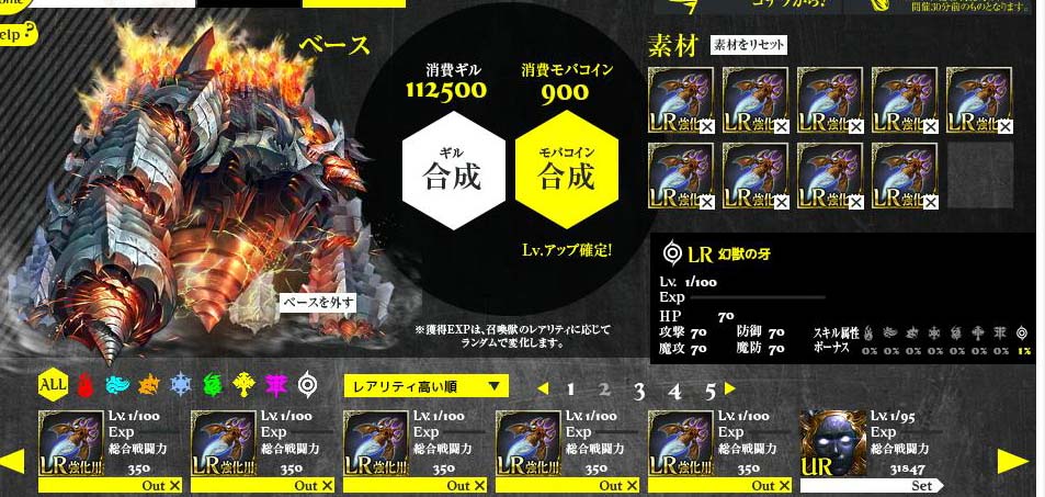 LR牙が9個あります。これを一気に無課金合成します。 ちなみに課金合成は牙1個につき、きっちり1ゲージ 上がります。レベル1でゲージ50%の状態なら レベル2でゲージ50%になるということです。 ブレることは無いようです。 さて、どうなることやら。 まず1個目・・なんだこりゃぁ!!ゲージが わずかに動いた程度!?無課金弾圧政策 恐るべし。 2個目・・さっきより上がりが良かった。 かなりランダム要素が強いみたい 途中省略して終了。レベル4と少しゲージ が上がっただけ。 結論。ギルによるスキル上げのように、完全にゼロ というのは無いようだ?上がるときは最高で80% ぐらいあがった。どっちにしろ、ステータスの変化は 極めて微量で意味がない。LR牙は20万ギルで 売れるため、これで180万ギルを失ったと同義。 同じように、UR牙は10万ギル、SR牙は2万ギルと 非常に高値で売れることから、合成に使うか 売却するか悩みどころ。5千万ギルを目指すなら 売却一択。 Copyright © CORE EDGE All Rights Reserved.